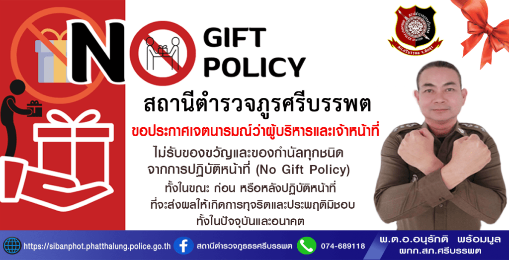 10.1 การดำเนินการเพื่อป้องกันการทุจริต 018 ประกาศนโยบายต่อต้านการรับสินบน(Anti-Bribery Policy) ประกาศนโยบายต่อต้านการรับสินบน (Anti-Bribery Policy) Anti-Bribery Policy Announcement ประกาศเจตนารมณ์ที่จะไม่รับของขวัญหรือของกำนัลทุกชนิดจาการปฏิบัติหน้าที่ (No Gift Policy) Announcement of intention not to accept gifts and presents of any kind in the performance of duties อินโฟกราฟฟิคนโยบายไม่รับของขวัญหรือของกำนัลทุกชนิดจาการปฏิบัติหน้าที่ (No Gift Policy) มีการเผยแพร่สื่ออินโฟกราฟฟิค ณ จุดประชาสัมพันธ์และจุดบริการ One Stop Service กลับสู่หน้าหลักBack To Homepage กลับสู่หน้า ITABack To ITA Page บริการประชาชน แจ้งเบาะแสเว็บไซต์กระทำความผิด แจ้งเบาะแส ร้องเรียน ร้องทุกข์ ข้อมูลสถานีตำรวจทั่วประเทศ ข้อมูลสถานีตำรวจสำหรับแจ้งการชุมนุมฯ ศูนย์กลางข้อมูลคู่มือสำหรับประชาชน กองทะเบียนประวัติอาชญากร กองการสอบ เว็บไซต์แนะนำ รัฐบาลไทย กองบัญชาการกองทัพไทย กองทัพบก กองทัพเรือ กองทัพอากาศ กรมประชาสัมพันธ์ สำนักงานตำรวจแห่งชาติ เว็บน่าสนใจ กองการสอบ กองสารนิเทศ (สท.) สมัครสอบโรงเรียนนายร้อยตำรวจ ข้อมูลสถิติคดีอาญา คดีจราจร กองบังคับการปราบปรามการค้ามนุษย์ โครงการพัฒนาเครือข่ายฯ รถยนต์สายตรวจ ติดต่อเรา เลขที่ 5 ม. 9 ต. เขาย่า อ.ศรีบรรพต จ.พัทลุง 93190 โทรศัพท์ : 074 – 689118 Facebook : สถานีตำรวจภูธรศรีบรรพต Line OA : สภ.ศรีบรรพต