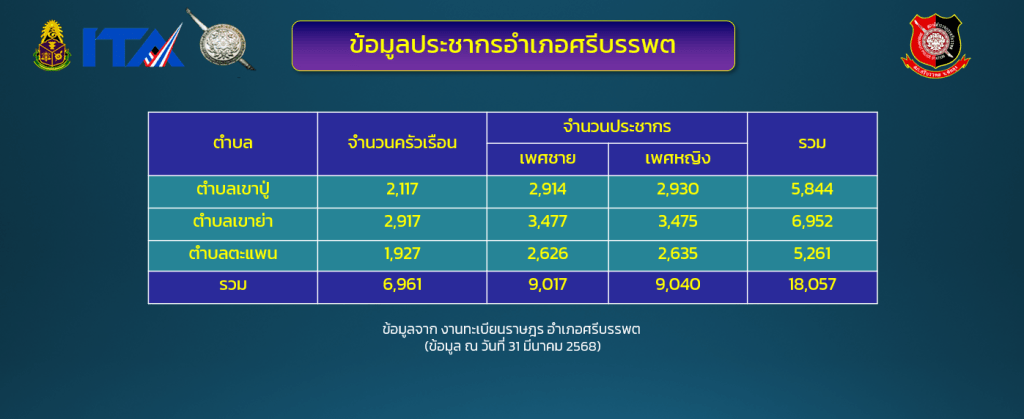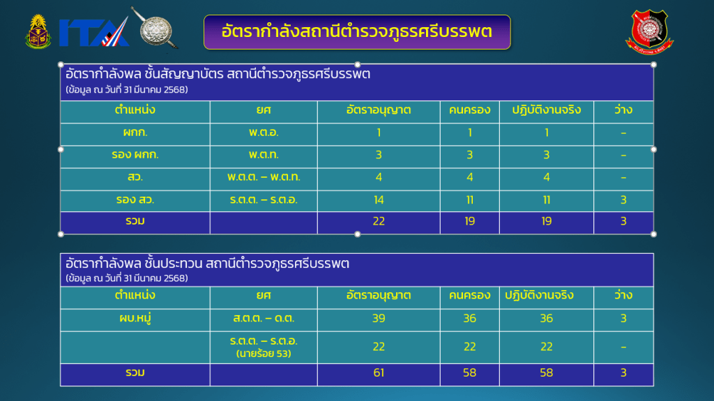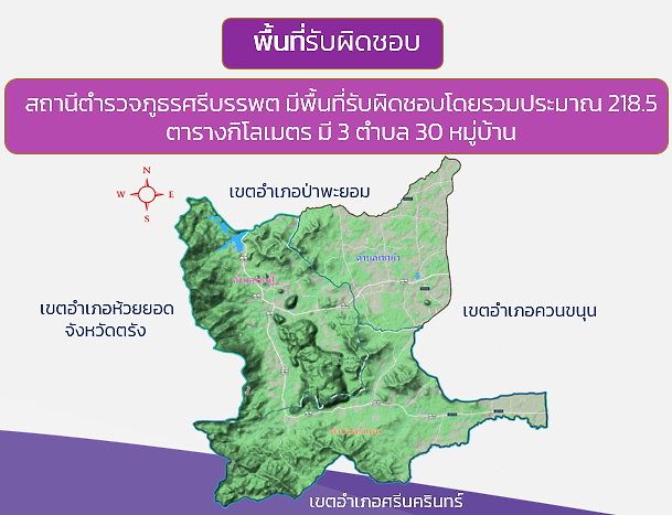 ข้อมูล ณ วันที่ 31 มีนาคม 2568 9.1 ข้อมูลพื้นฐาน 02 ข้อมูลผู้บริหาร อัตรากำลังและพื้นที่รับผิดชอบ ผู้บริหารของสถานีตำรวจภูธรศรีบรรพต ผกก.สภ.ศรีบรรพต (หัวหน้าสถานี) พ.ต.อ.อนุรักติ พร้อมมูล ผกก.สภ.ศรีบรรพต โทร. 081-409-4946 รอง ผกก. สภ.ศรีบรรพต พ.ต.ท.ภิรมย์ เอียดสังข์ รอง ผกก.(สอบสวน) สภ.ศรีบรรพต (หัวหน้างานสอบสวน) โทรศัพท์ : 08-9168-8408 พ.ต.ท.จรูญ วิเชียรบรรจง รอง ผกก.ป.สภ.ศรีบรรพต (หัวหน้างานป้องกันปราบปราม) โทรศัพท์ : 08-9870-3073 พ.ต.ท.อรรถวัฒน์ ดีลา รอง ผกก.สส.สภ.ศรีบรรพต (หัวหน้างานสืบสวน) โทรศัพท์ : 081-086-1047 สารวัตร สภ.ศรีบรรพต พ.ต.ท.ฉัตติชัย ขาวขำ สวป.สภ.ศรีบรรพต โทรศัพท์ : 08-1609-0708 พ.ต.ท.เรวัตร นุ้ยฉิม สว.สส.สภ.ศรีบรรพต โทรศัพท์ : 065-352-6536 พ.ต.ท.ธีระยุทธ มิตรมูสิก สว.อก.สภ.ศรีบรรพต โทรศัพท์ : 08-8784-5647 พ.ต.ต.เอก เต็มพุทธ สว.(สอบสวน)สภ.ศรีบรรพต โทรศัพท์ : 08-0542-0005 รองสารวัตร สภ.ศรีบรรพต ร.ต.อ.วิรัตน์ ดำช่วย รอง สวป.สภ.ศรีบรรพต โทรศัพท์ : 08-4440-3526 ร.ต.อ.วีรพงค์ นาคเกลี้ยง รอง สวป.สภ.ศรีบรรพต โทรศัพท์ : 08-1097-8867 ร.ต.อ.ประสิทธิ์ หมื่นแกว้น รอง สวป.สภ.ศรีบรรพต โทรศัพท์ : 08-1906-2078 ร.ต.อ.นนธวัฒน์ รามหนู รอง สว.(สอบสวน)สภ.ศรีบรรพต โทรศัพท์ : 08-5798-6280 ร.ต.อ.มานิตย์ ชนะกาญจน์ รอง สว.(สอบสวน)สภ.ศรีบรรพต โทรศัพท์ : 08-4069-9451 ร.ต.อ.สมหมาย เกื้อสุข รอง สว.(สอบสวน)สภ.ศรีบรรพต โทรศัพท์ : 08-0711-5744 ร.ต.อ.บุญรักษ์ ชูทอง รอง สว.(สอบสวน)สภ.ศรีบรรพต โทรศัพท์ : 08-1543-0983 ร.ต.อ.ฉัตรชัย สงคง รอง สว.สส.สภ.ศรีบรรพต โทรศัพท์ : 08-9659-8890 ร.ต.อ.สาวิทย์ ขุนแทน รอง สว.สส.สภ.ศรีบรรพต โทรศัพท์ : 06-3081-1193 ร.ต.อ.วรวิทย์ รอดขำ รอง สว.สส.สภ.ศรีบรรพต โทรศัพท์ : 08-6297-7872 ร.ต.อ.กุมาระ พูลเอียด รอง สวป.(ชส) สภ.ศรีบรรพต โทรศัพท์ : 08-1689-4467 อัตรากำลังสถานีตำรวจภูธรศรีบรรพต พื้นที่รับผิดชอบ พื้นที่รับผิดชอบ สถานีตำรวจภูธรศรีบรรพต : ตั้งอยู่ทางทิศเหนือของจังหวัดพัทลุง อยู่ห่างจากศาลากลางจังหวัดพัทลุง ตามเส้นทางหลวงจังหวัด 33 กิโลเมตร มีพื้นที่รับผิดชอบประมาณ 218.50 ตารางกิโลเมตร หรือประมาณ 136,565 ไร่ สภาพทางภูมิศาสตร์โดยทั่วไป เป็นพื้นที่ราบสูง มีภูเขาต่ำ ๆ สลับซับซ้อน ของแนวเทือกเขาบรรทัด มีเนินสูง ทางทิศตะวันตกแล้วค่อย ๆ ลาดต่่ำลงมาทางทิศตะวันออก อาณาเขตติดต่อ อาณาเขตติดต่อทิศเหนือ ติดต่อกับ อำเภอป่าพะยอมจังหวัดพัทลุงทิศใต้ ติดต่อกับ อำเภอศรีนครินทร์ จังหวัดพัทลุงทิศตะวันออก ติดต่อกับ อำเภอควนขนุน จังหวัดพัทลุงทิศตะวันตก ติดต่อกับ อำเภอนาโยงและอ าเภอห้วยยอด จังหวัดตรัง พื้นที่รับผิดชอบ จำนวน 3 ตำบล 1. ตำบลเขาปู่ 2. ตำบลเขาย่า 3. ตำบลตะแพน จำนวนประชากรในพื้นที่ วันที่จัดทำข้อมูล : 31 มีนาคม พ.ศ.2568 กลับสู่หน้าหลักBack To Homepage กลับสู่หน้า ITABack To ITA Page บริการประชาชน แจ