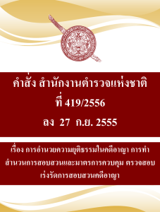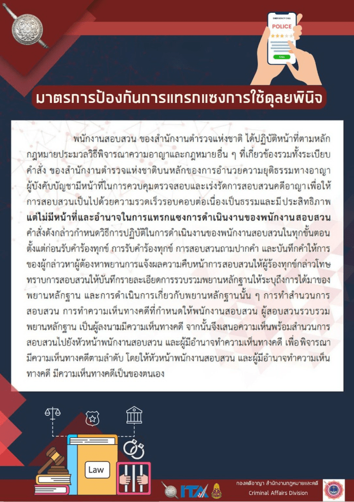 กฎหมายที่เกี่ยวข้อง กฎหมายใหม่ที่ประชาชนควรรู้ พระราชบัญญัติว่าด้วยการปรับเป็นพินัย พ.ศ.2565พระราชบัญญัติ ป้องกันและปราบปราม การทรมานและการกระทำให้บุคคลสูญหาย พ.ศ. 2565พระราชบัญญัติจราจรทางบก พ.ศ.2565พระราชบัญญัติคุ้มครองข้อมูลส่วนบุคคล พ.ศ.2562กฎหมายเกี่ยวกับบุหรี่ไฟฟ้าพ.ร.บ.จราจรทางบกพ.ร.บ.บัตรประจำตัวประชาชนพระราชบัญญัติการทะเบียนราษฎร (ฉบับที่ 3) พ.ศ. 2562พ.ร.บ.คุมครองข้อมูลข่าวสารคอมพิวเตอร์กฎหมายครอบครัวกฎหมายกับการกระทําความผิดของเด็กและเยาวชนกฎหมายว่าด้วยมรดกกฎหมายและนโยบายการควบคุมยาสูบอย่างครอบคลุมความรู้เกี่ยวกับกฎหมายว่าด้วยสุรา กฎหมายที่มีการบังคับใช้ในสถานีตำรวจ ประมวลกฎหมายอาญาประมวลกฎวิธีพิจารณาคดียาเสพติดประมวลกฎหมายวิธีพิจารณาความอาญาประมวลกฎหมายยาเสพติดแก้ไขเพิ่มเติมประมวลกฎหมายอาญา (ฉบับที่ ๒๘)แก้ไขเพิ่มเติมประมวลกฎหมายอาญา (ฉบับที่ ๒๖) กฎหมายในควารับผิดชอบของสำนักงานตำรวจแห่งชาติ พระราชบัญญัติตำรวจแห่งชาติ พ.ศ. 2565พระราชบัญญัติข้อมูลข่าวสารของราชการ พ.ศ. 2540พระราชบัญญัติ การจัดซื้อจัดจ้างและการบริหารพัสดุภาครัฐ พ.ศ. 2560กฎ ก.ตร. ว่าด้วยการแต่งตั้งข้าราชการตํารวจ พ.ศ. 2561กฎ ก.ตร.ว่าด้วยหลักเกณฑ์และวิธีการแต่งตั้งยศ พ.ศ.2554กฎ ก.ตร.ว่าด้วยหลักเกณฑ์และวิธีการพิจารณาเลื่อนเงินเดือนข้าราชการตำรวจ พ.ศ. 2556 กฎ ก.ตร.ว่าด้วยการกำหนดหลักเกณฑ์และวิธีการพิจารณาเลื่อนเงินเดือนข้าราชการตำรวจ พ.ศ.2556แผนการป้องกันและบรรเทาสาธารณภัย สำนักงานตำรวจแห่งชาติ พ.ศ.2559แนวปฏิบัติเพื่อป้องกันและแก้ไขปัญหาการล่วงละเมิดหรือคุกคามทางเพศในการทำงาน คลิ๊กเพื่ออ่านต่อ คลิ๊กเพื่ออ่านต่อ คลิ๊กเพื่ออ่านต่อ คลิ๊กเพื่ออ่านต่อ คลิ๊กเพื่ออ่านต่อ คลิ๊กเพื่ออ่านต่อ คลิ๊กเพื่ออ่านต่อ กฎหมายในการปฏิบัติราชการของสำนักงานตำรวจแห่งชาติ พระราชบัญญัติตำรวจแห่งชาติ พ.ศ. 2565 พระราชบัญญัติข้อมูลข่าวสารของราชการ พ.ศ. 2540 พระราชบัญญัติ การจัดซื้อจัดจ้างและการบริหารพัสดุภาครัฐ พ.ศ. 2560 พระราชบัญญัติการชุมนุมสาธารณะ พ.ศ. 2558 พระราชบัญญัติธุรกิจรักษาความปลอดภัย พ.ศ.2558 แนวทางปฏิบัติตามกฎหมาย มาตรการป้องกันแทรกแซง การใช้ดุลยพินิจ แนวปฏิบัติในการใช้ดุลยพินิจไม่รับคำร้องทุกข์ในคดีอาญา แนวปฏิบัติในการสอบปากคำของพนักงานสอบสวน สิทธิของผู้เสียหายหรือเหยื่ออาชญากรรมและสิทธิผู้ต้องหา กลับสู่หน้าหลักBack To Homepage